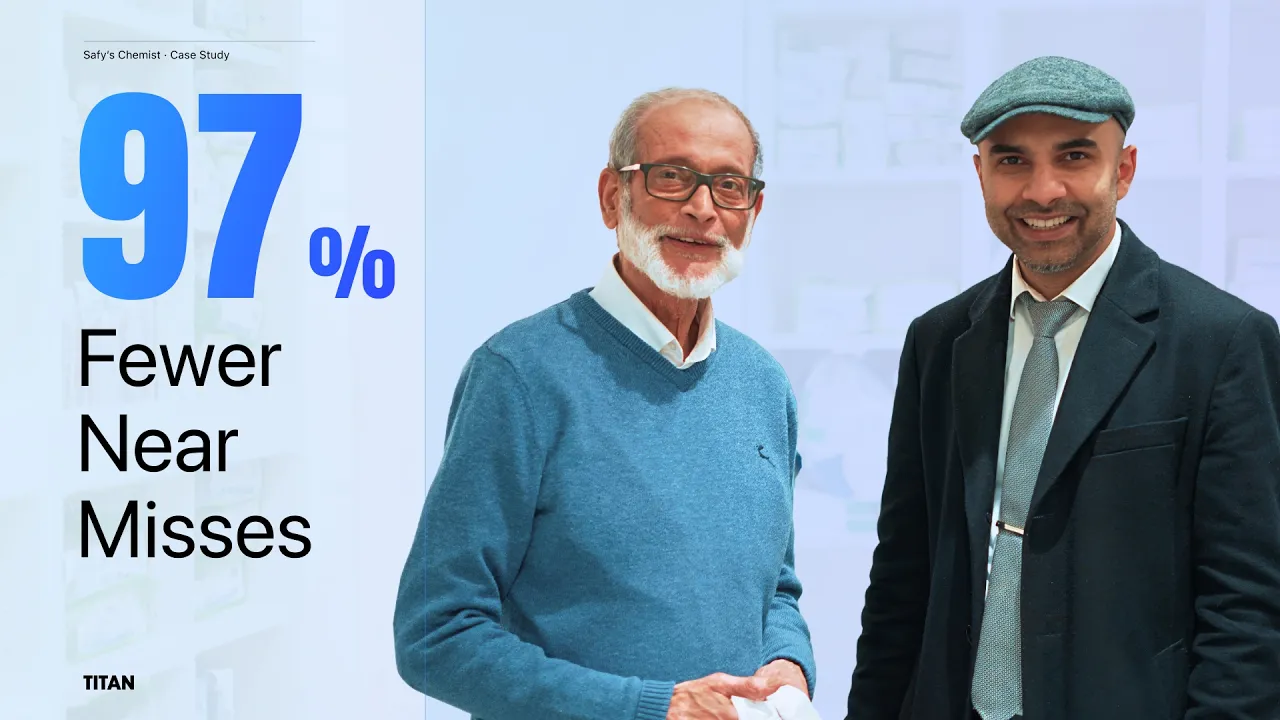 Safy's Chemist on Melton Road has served its community for 45 years. Today, it's one of the busiest pharmacies in the area, dispensing 14,500-15,000 items every month. But a year ago, the pharmacy was averaging 5-6 near misses per month, and pharmacist Asif was spending his entire day checking prescriptions. Since switching to Titan, near misses have dropped to just 2 in an entire year. Asif now spends 85% of his time on services. And the 80-year-old superintendent? He loves it.
